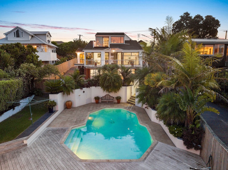 You will be greeted by a grand double door entrance into a home of pristine presentation. New soft tone carpets have been laid throughout the home and each room has a purpose in mind for the ease of living. On the first level you will find a separate family room, large office, two good sized bedrooms flowing out to their own private patio. You will appreciate the modern sleek entertainer's kitchen adjoining a spacious open plan dining, a light filled large lounge that seamlessly flows out to a balcony with breath-taking views across to Rangitoto and the Hauraki Gulf. You get to take in the magnitude of this property with an inviting swimming pool & entertainers soiree dream spot with its very own self-contained studio/pool house set on a fully fenced 1029m2 section!