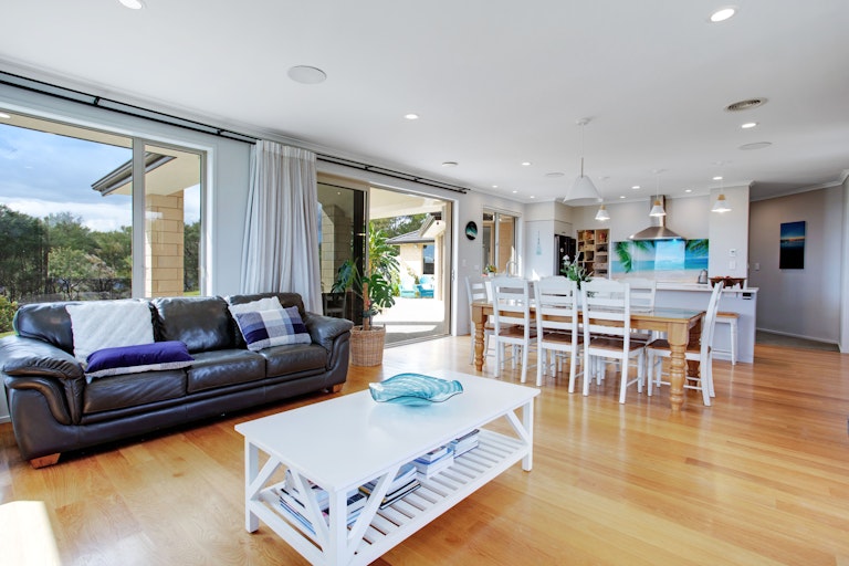 Built in 2015, this five-bedroom, two-bathroom home has been crafted for comfort, with thoughtful design woven into every detail. The fifth bedroom, often used as a home office, offers flexibility, while two expansive living areas and a third cozy TV or chill-out nook provide ample space for relaxation. Sunlight spills through large windows, illuminating the American oak floors that stretch across the open-plan kitchen and dining area. Here, the modern kitchen is a chef's dream, complete with a large oven, induction cooktop, and a spacious scullery-perfect for those who love to cook and entertain.