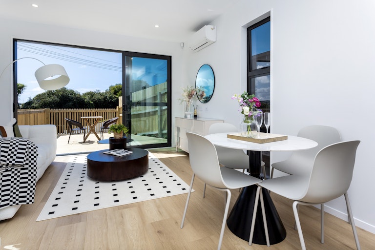 Downstairs: open-plan living with guest toilet, flowing to a sunny deck.