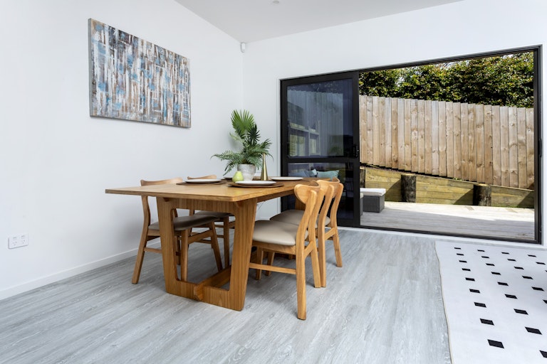Downstairs: spacious open-plan kitchen, dining & living with guest toilet, extending to a generous deck.