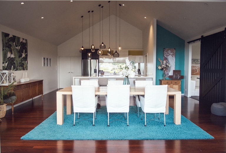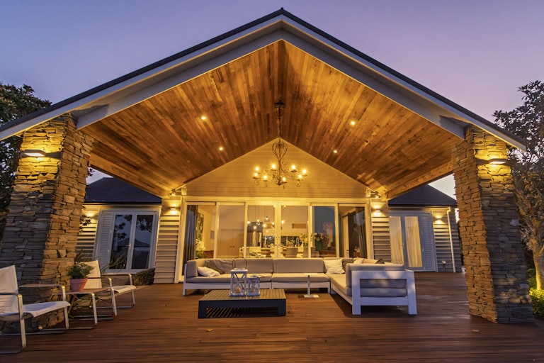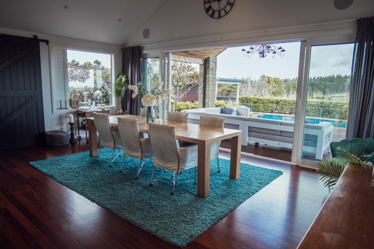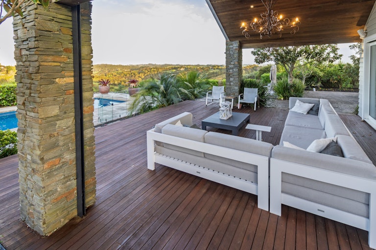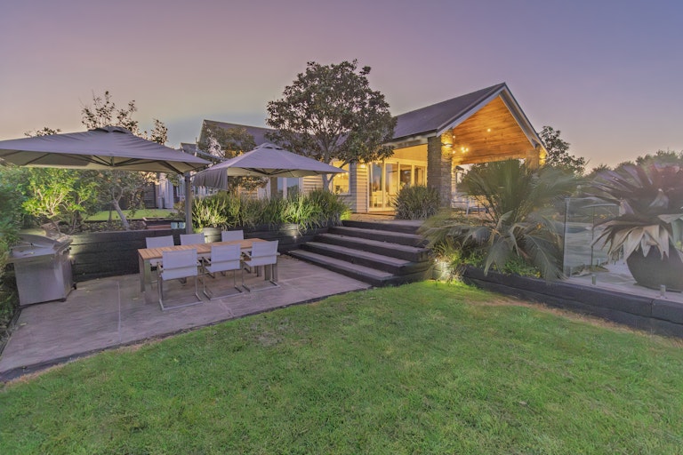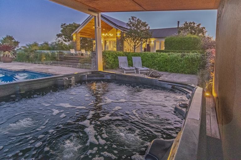 Step outside and the resort feel continues - an expansive covered entertaining area with rich timber ceilings overlooks the heated swimming pool, spa, and cabana, framed by 180-degree views of the surrounding countryside and native bush.
