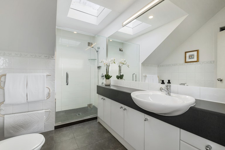 Also downstairs is a spacious double bedroom with ensuite/family bathroom complete with a bath and separate shower. Upstairs, retreat to the master suite with its generous walk-in wardrobe and ensuite. The bedroom captures sweeping sea and Rangitoto views, best enjoyed from your private deck to view the stunning sunrises. A further third bedroom plus an open office/landing provide flexibility, whether for a sitting area or working from home.