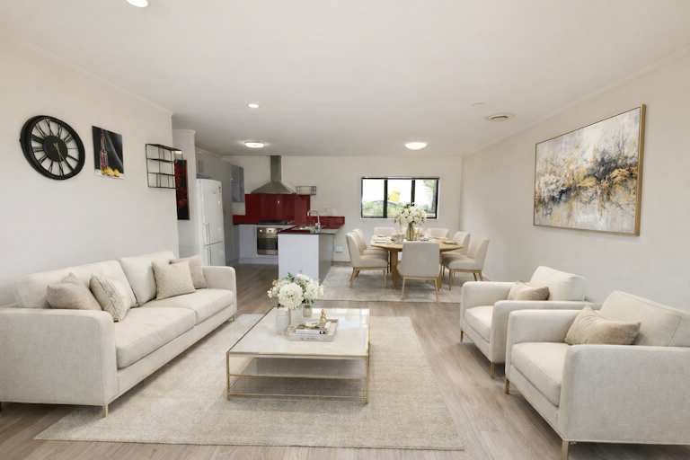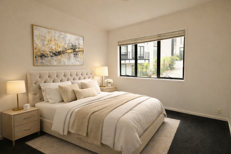 The open-plan kitchen, dining, and living area flows seamlessly to a sunny deck framed by lush greenery, creating a peaceful retreat just minutes from Birkenhead's cafés, shops, and transport links. Upstairs, two generous bedrooms share a family bathroom, while the ground-floor bedroom with its own ensuite offers excellent flexibility for guests, flatmates, or working from home. With the new carpet included, there is also clear scope to add further value over time, at your own pace.