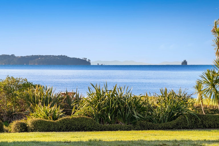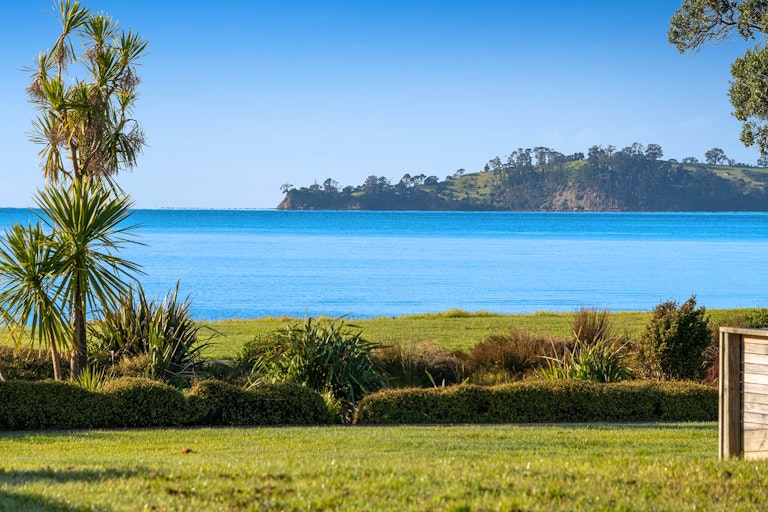 The property commands stunning 180-degree views over Kawau Bay, a dynamic vista filled with swimmers, sailing boats, kayaks, windsurfers, and the comings and goings from the Sandspit Marina.