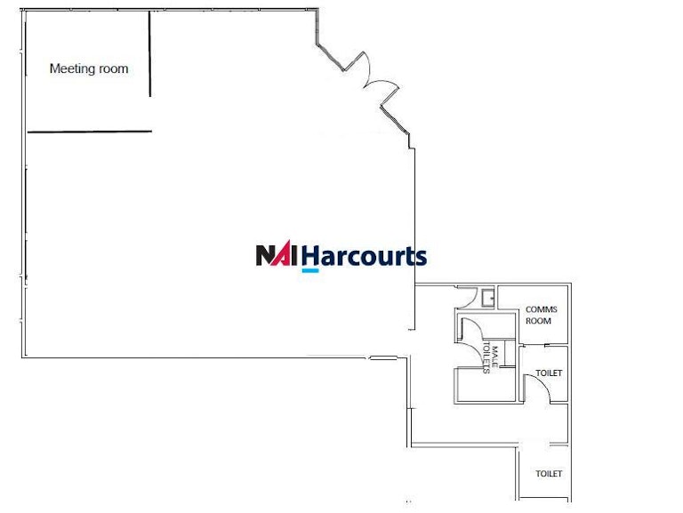 The ground-level, open-plan layout with meeting room, includes a functional kitchen and two toilets, providing a professional and versatile environment.