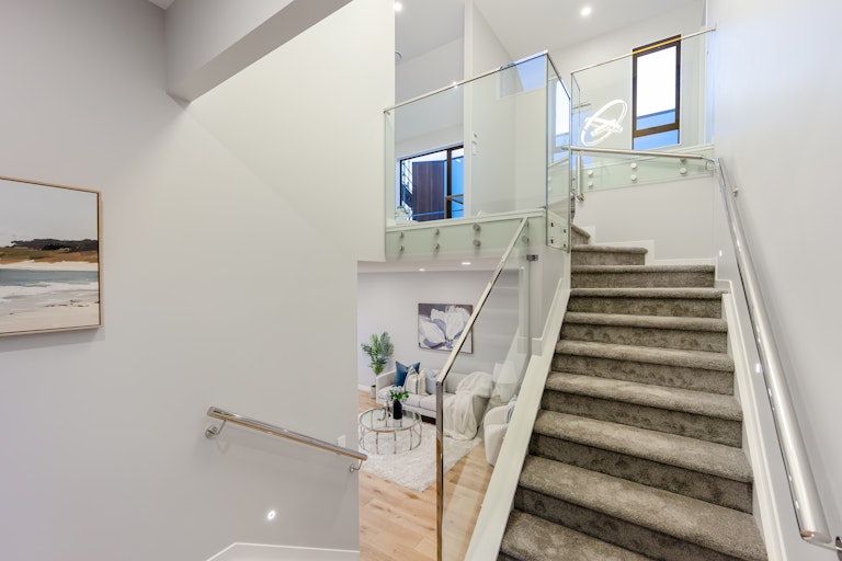 The mid-level provides a flexible family lounge or office, two generous bedrooms, and a modern bathroom with both bath and shower. The top floor is dedicated to the north-facing master retreat, featuring a walk-in wardrobe and elegant en-suite. Plush carpets and a statement chandelier elevate the sense of comfort and style.