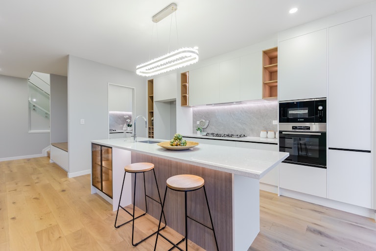 The open-plan kitchen, dining, and living area is an entertainer's dream. Featuring premium Bosch appliances, gas cooking, and a kitchenette complete with an extra hob and sink, it's built for those who love to cook and host. A sleek glass-door display cabinet with soft LED lighting adds a subtle touch of style to the living area, while large sliding doors open seamlessly to a sun-soaked deck and landscaped garden, perfect for summer barbecues and relaxed outdoor living.