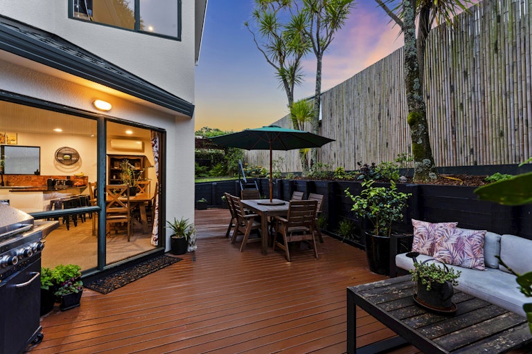 Spread over two levels, the home features three generous bedrooms and two bathrooms, including a serene master suite complete with an ensuite and double wardrobe. The contemporary open-plan design connects the kitchen, dining, and living zones seamlessly, flowing out to expansive decks that capture all-day sun. Whether hosting friends or enjoying quiet evenings outdoors, the superb indoor-outdoor connection makes entertaining a joy.