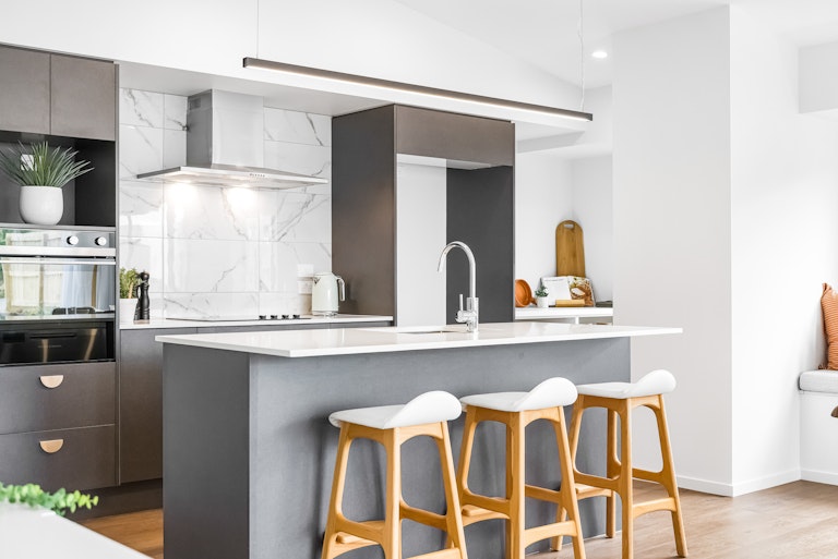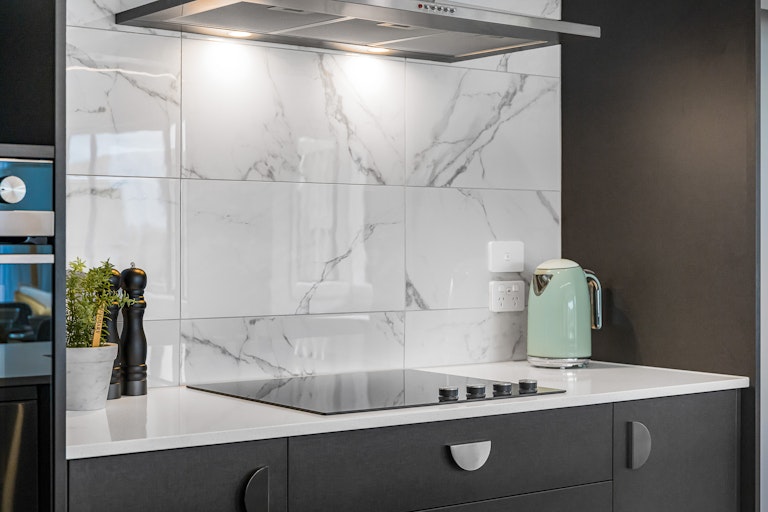 • Modern kitchen with stone benchtops and sleek appliances
