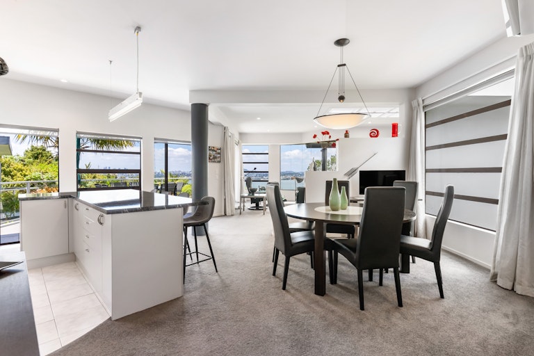 The home celebrates modern architectural design, with clean lines and sun drenched interiors flowing across four living rooms and a versatile sleepout, each oriented to capture stunning Waitematā Harbour, Harbour Bridge, and city skyline views.