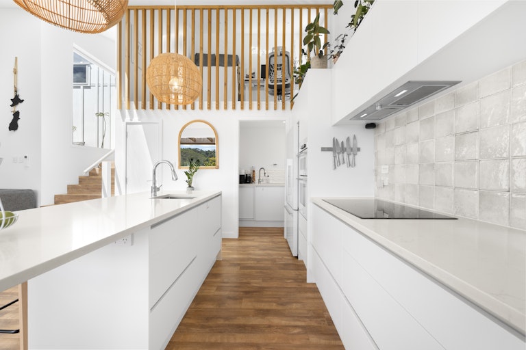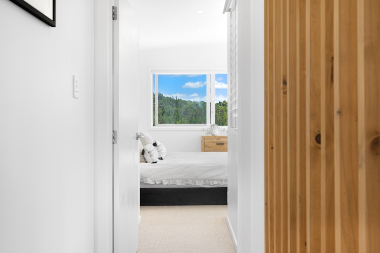 The heart of the home opens into soaring 4m contoured ceilings, skylights that flood the living spaces with light, and 6m sliding stacker doors that dissolve the boundary between inside and out. Step onto 70sqm of covered decking - a year-round haven overlooking bush views - or wash off a day at the beach under the outdoor shower.