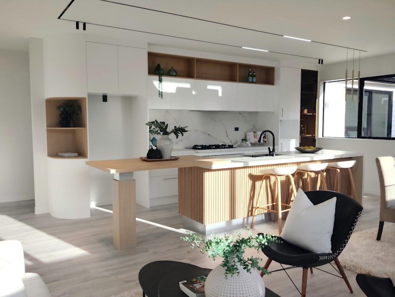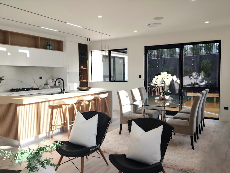 Inside, the spacious open-plan kitchen, dining and living area is the home's heart. This seamless design feels airy, perfect for family time or hosting. The central kitchen, with modern appliances, has a practical layout that makes cooking effortless.