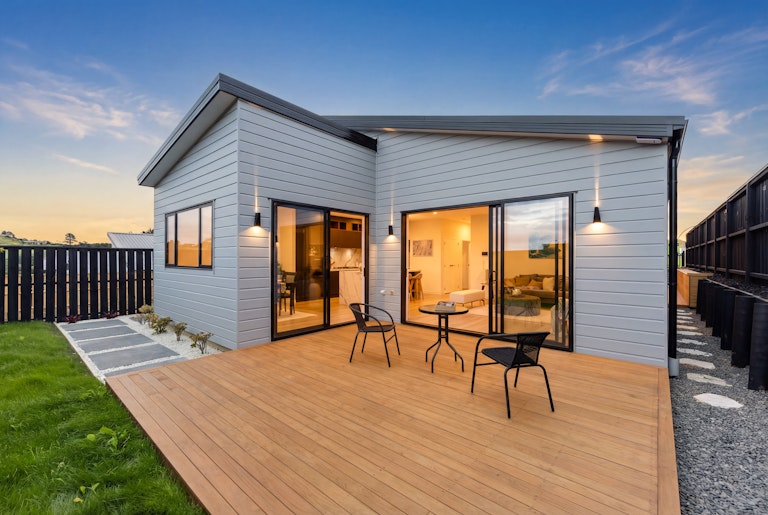 The open-plan kitchen, dining, and living area forms the centre of daily life. Designed with practicality in mind, the kitchen features stone benchtops, stainless steel appliances, a scullery and ample storage. This space flows naturally to the outdoor deck through large sliding doors, extending the living area and creating an ideal setting for entertaining or relaxed family time.