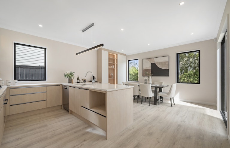 • Open-plan contemporary kitchen and dining, featuring sleek cabinetry designed for both style and function