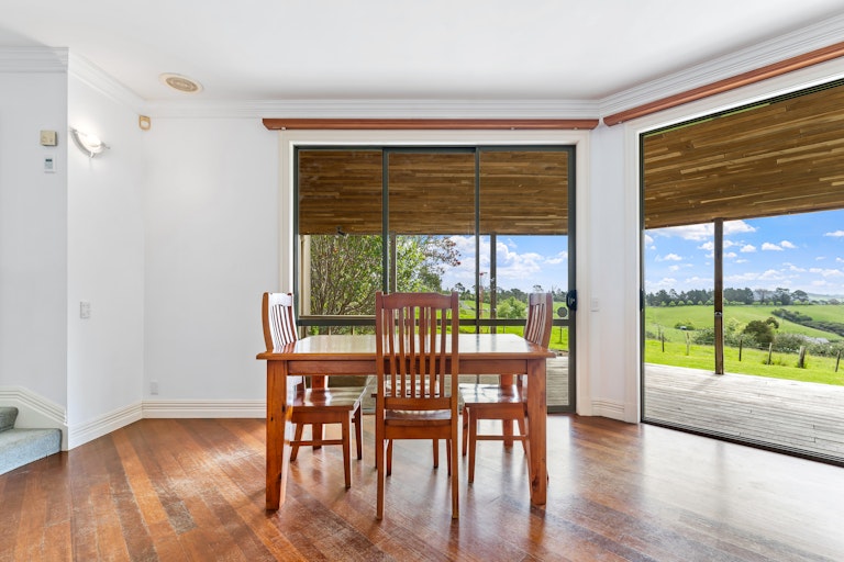 • Multiple living zones extend to large covered deck with elevated rural and bush views.