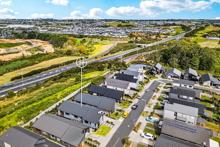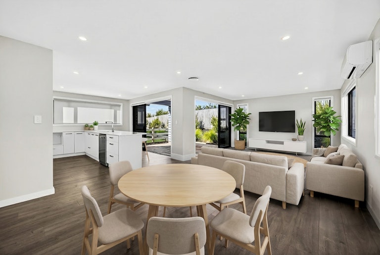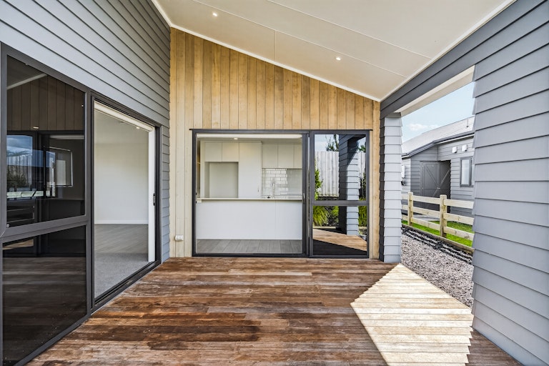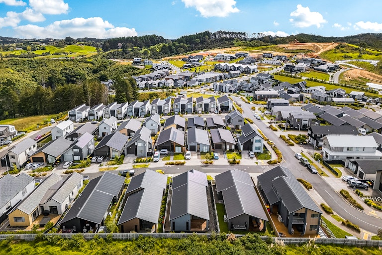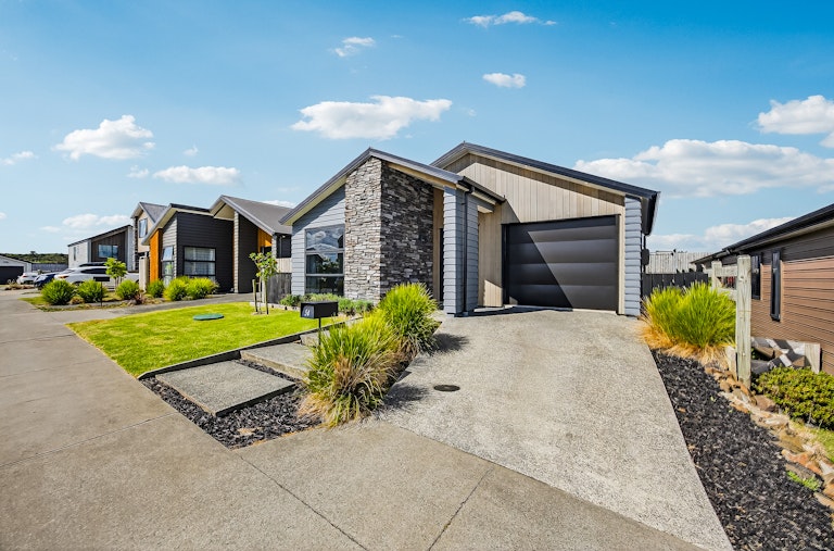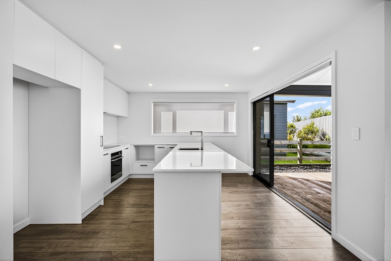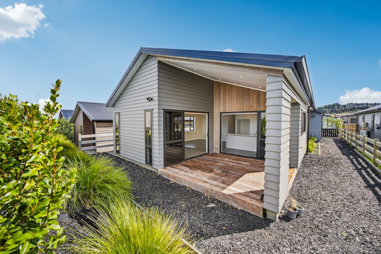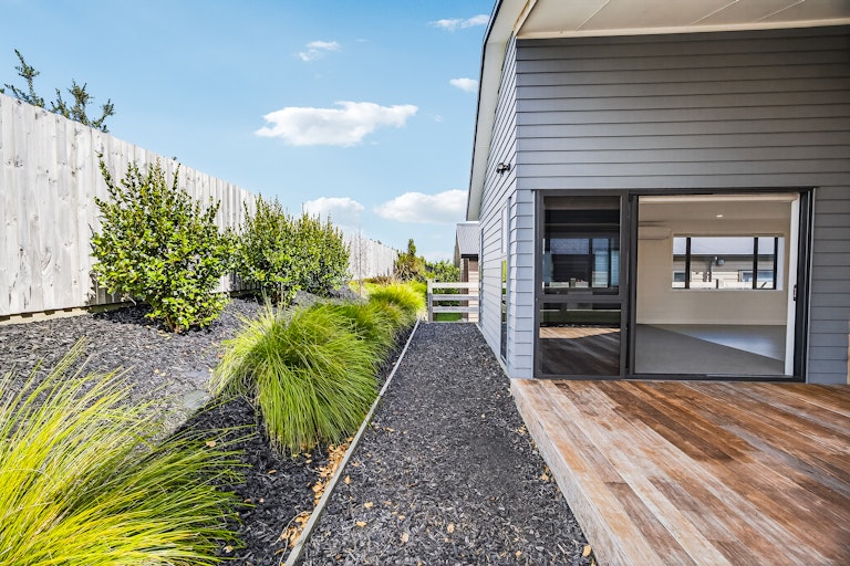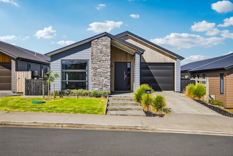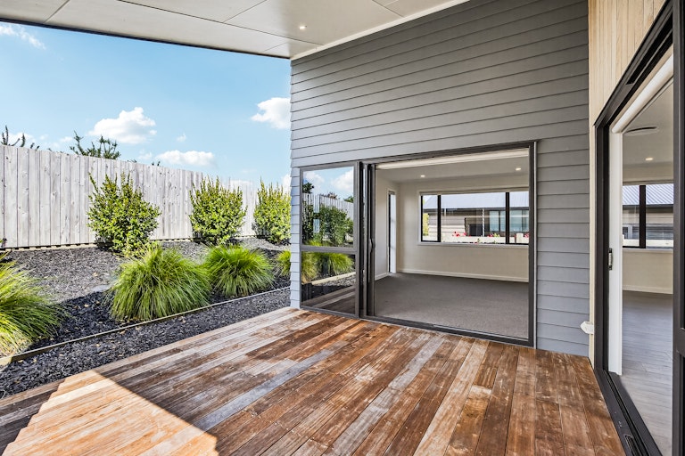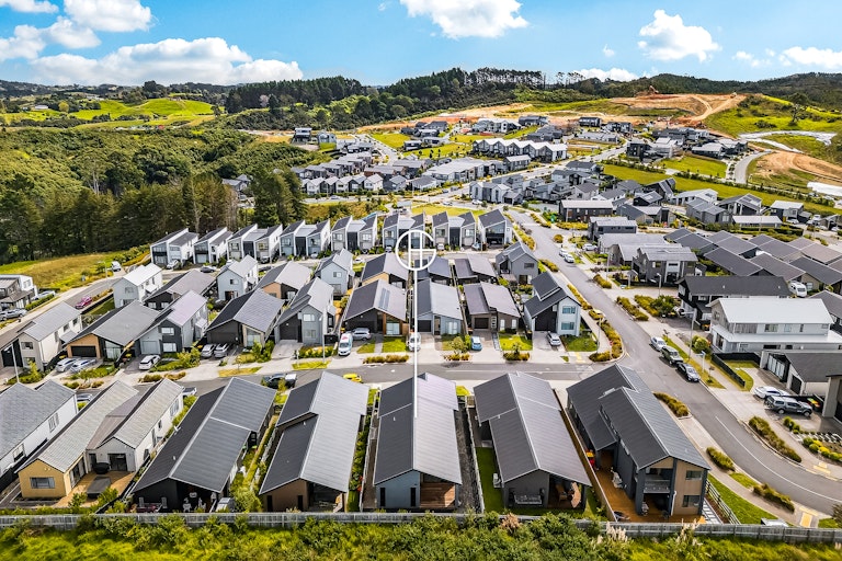 Positioned in the heart of Orewa's Ara Hills, this modern home offers sharp design, smart use of space and an easy-care setup that makes ownership straightforward. Light pours through the open spaces and wide stacker doors, pulling the outdoors in and creating a natural flow onto the kwila deck. The kitchen sits right at the centre of the home with a large island, modern finishes and quality Fisher & Paykel appliances that make it both practical and social. Clean lines and bright interiors give the entire home a fresh, modern feel.