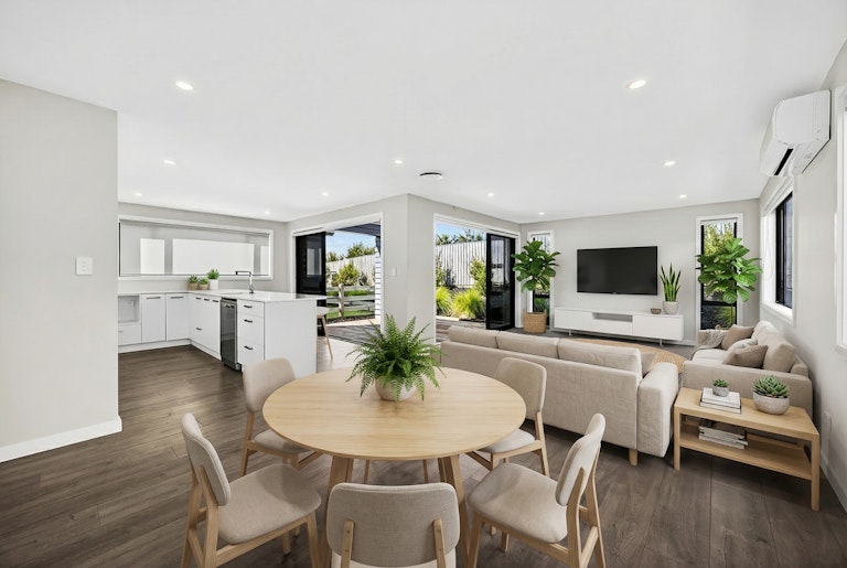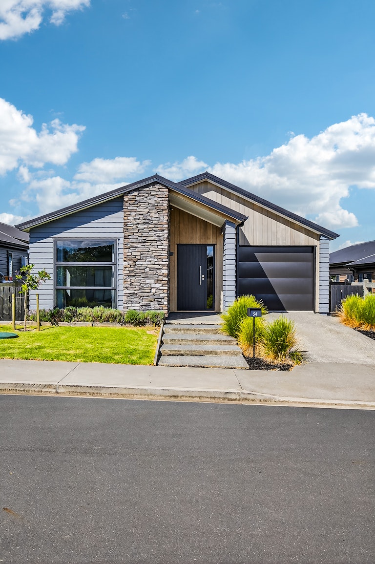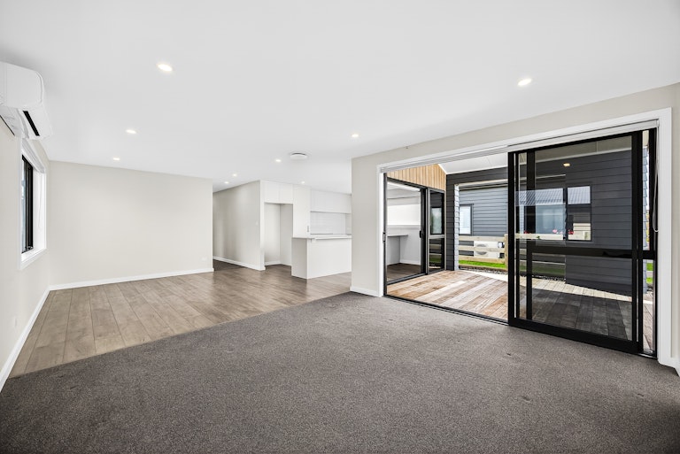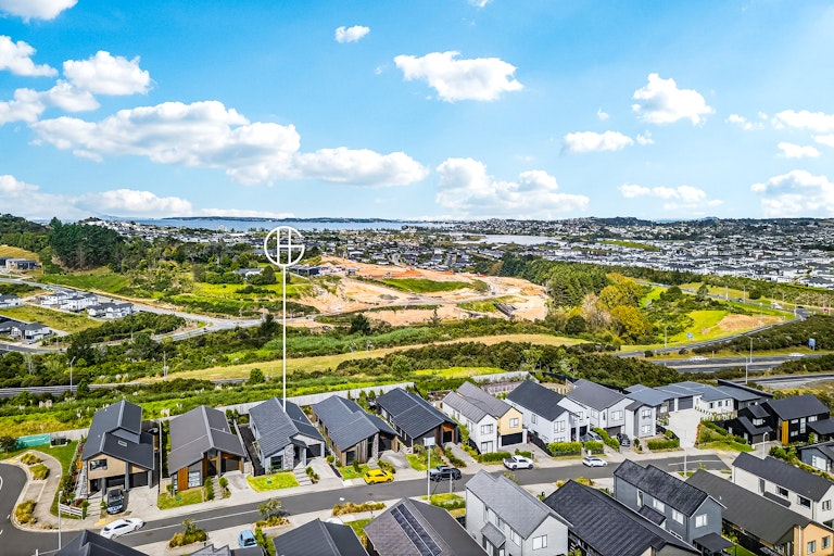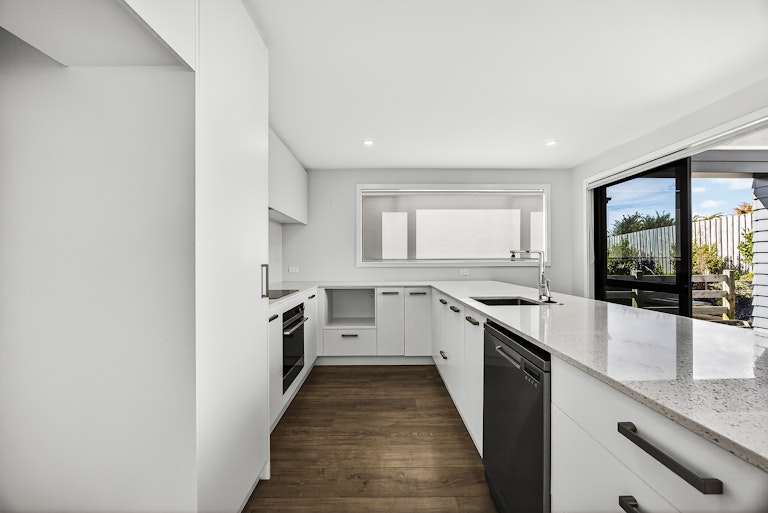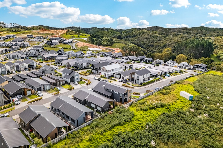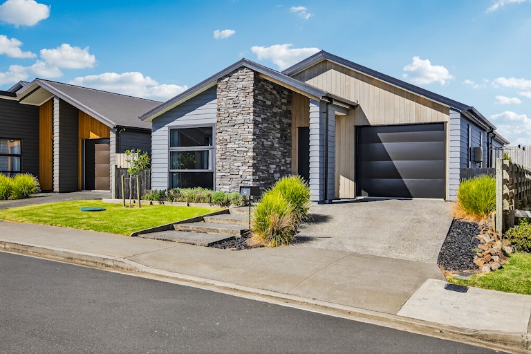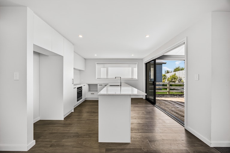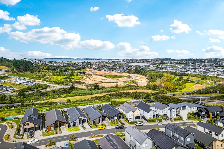 Positioned in the heart of Orewa's Ara Hills, this modern home offers sharp design, smart use of space and an easy-care setup that makes ownership straightforward. Light pours through the open spaces and wide stacker doors, pulling the outdoors in and creating a natural flow onto the kwila deck. The kitchen sits right at the centre of the home with a large island, modern finishes and quality Fisher & Paykel appliances that make it both practical and social. Clean lines and bright interiors give the entire home a fresh, modern feel.