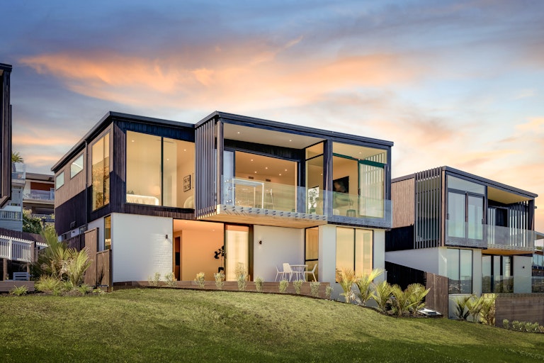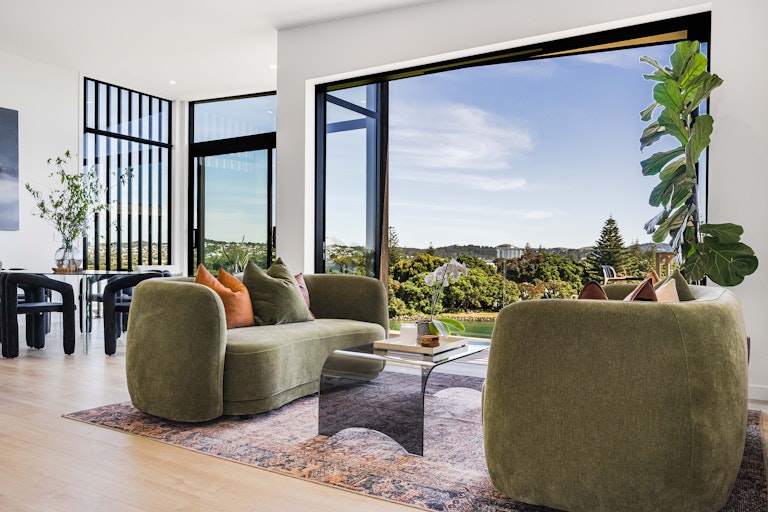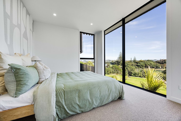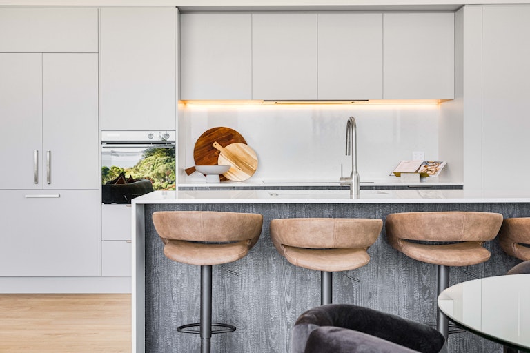 The home's striking combination of Abodo vertical cladding and brick sits confidently within its coastal setting, chosen for both durability and timeless appeal. Inside, full-height joinery frames uninterrupted views across the estuary and out to Orewa Beach, flooding the interiors with natural light throughout the day. Upstairs, expansive open-plan living takes centre stage, where wide sliders pull back to make the outlook the hero of everyday living. The kitchen is sleek and refined, with high-end appliances seamlessly integrated behind custom cabinetry, complemented by a hidden butler's pantry offering generous additional storage and workspace.