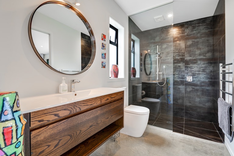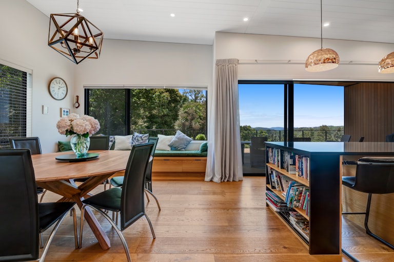 Expansive hardwood garapa decking and cedar cladding frame the main outdoor living spaces, creating a warm, understated elegance that sits naturally within the landscape. Indoor-outdoor living flows seamlessly from the kitchen to a covered, heated deck, perfectly positioned to take in the rural and coastal outlook. A wood-burner in the lounge, completes the picture, for cosy winter months.