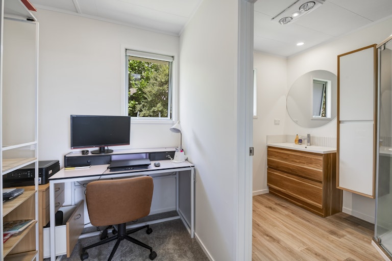 The main residence features three spacious bedrooms plus a study, two bathrooms, including an ensuite, and a spacious light-filled living area that opens to a sunny north-facing sunroom, stepping out on to a large front deck taking in the north facing sunny outlook, and stunning evening sunsets! It's perfect for everyday living and entertaining. The dining area sits alongside the newly decorated modern gulley kitchen stepping out to the backyard lined with apple trees and an easy care garden. Plus double-glazed windows throughout the house, great for cooling during summer and warming in the winter months.