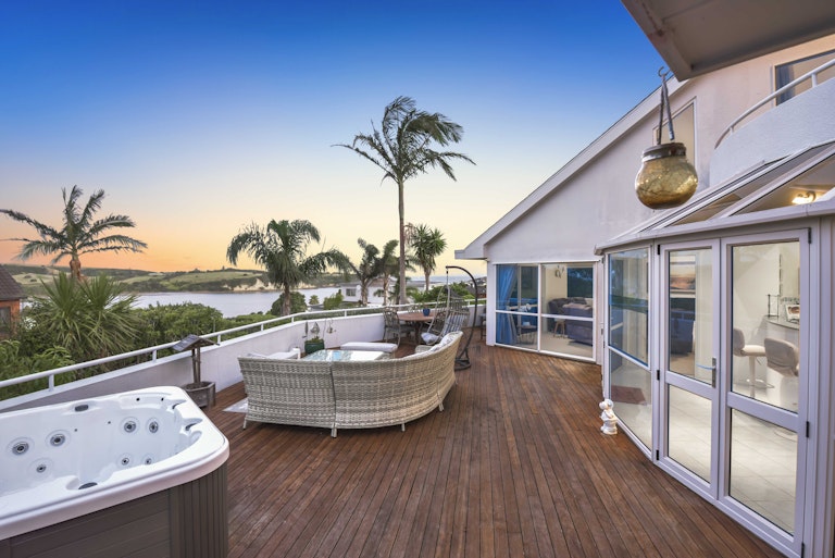 Upstairs is the master suite with a walk-in robe and a large, tiled bathroom with a spa bath, shower, toilet, and bidet. This opens out onto a private deck with elevated sea views.