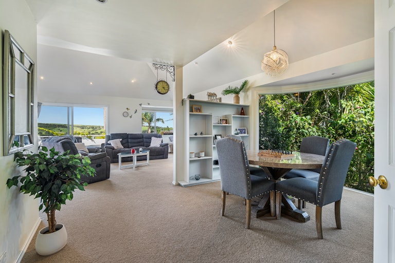 The architecturally designed home is expansive and split over two levels. The first level has a large lounge that opens onto the decking area, where entertaining is easy as you soak in the sunshine and views. There is a separate dining area, a spacious kitchen, with an additional seating area opening onto the deck.