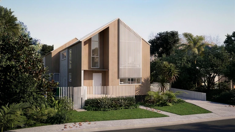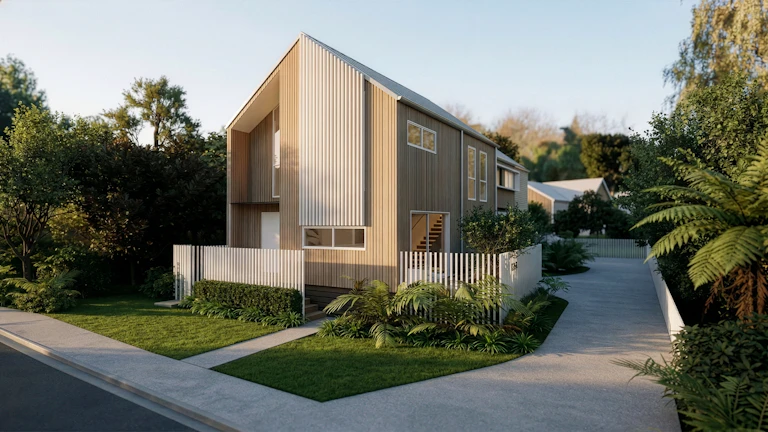 Defined by vertical thermally modified timber cladding and sculptural gable lines, the exterior