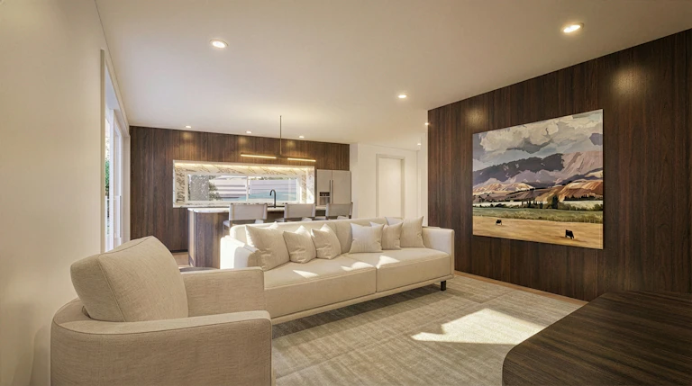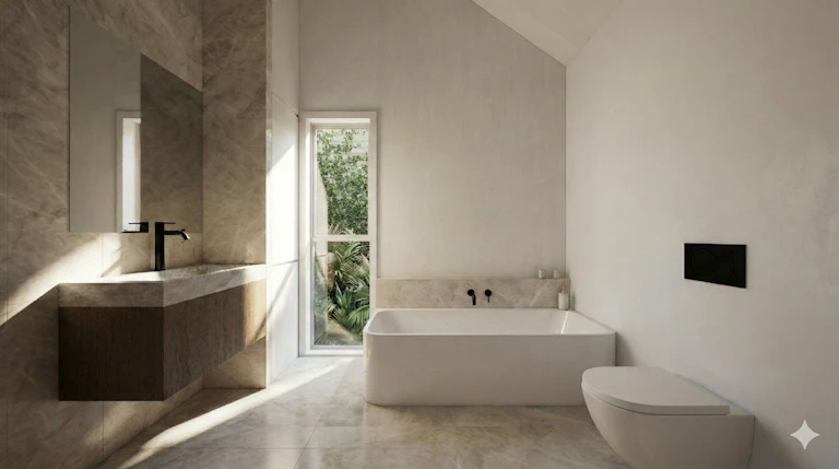 large-format European ceramics tiles, custom vanities and internal access garaging, complete