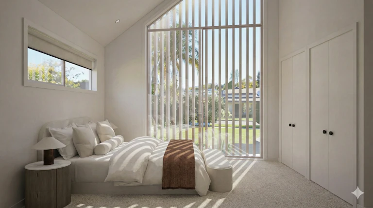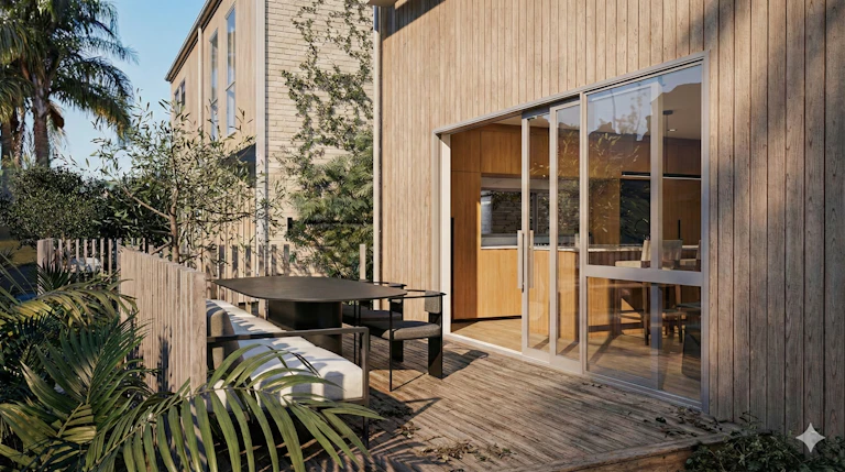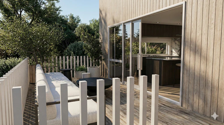 Floor-to-ceiling sliders extend living effortlessly to a private hardwood deck, creating seamless