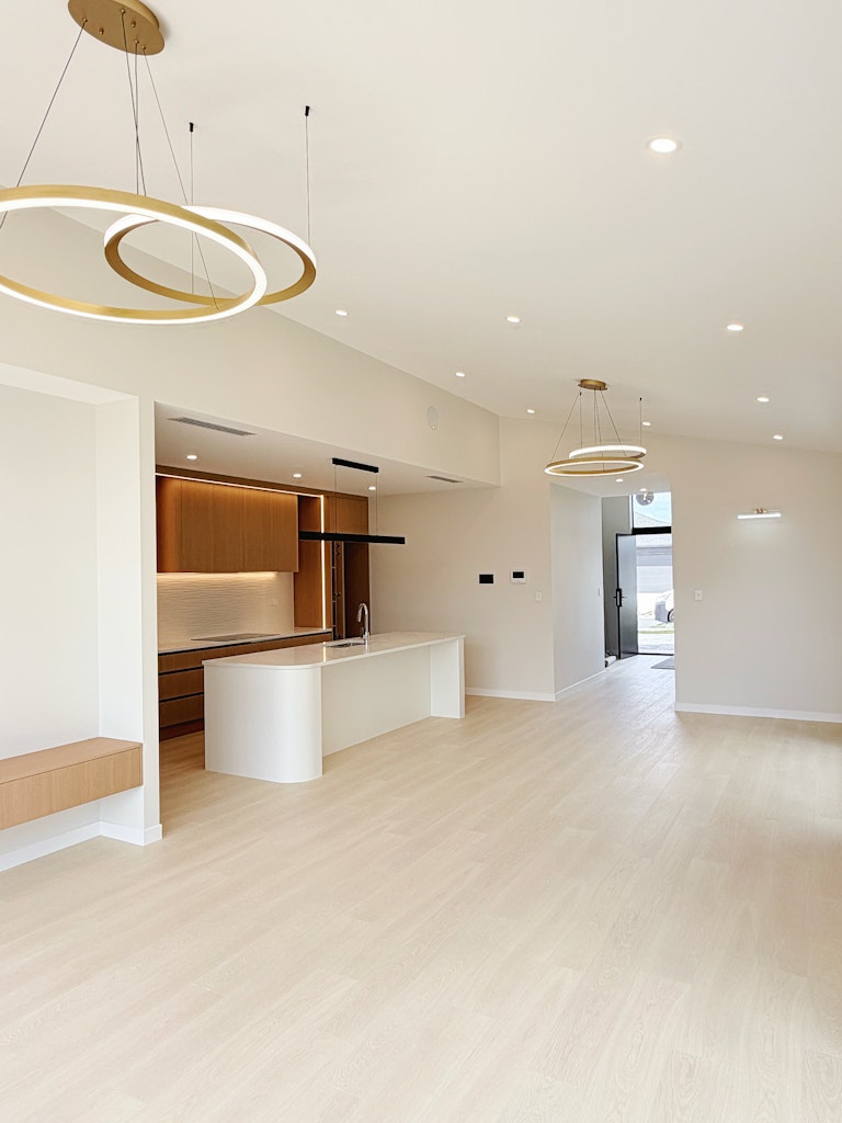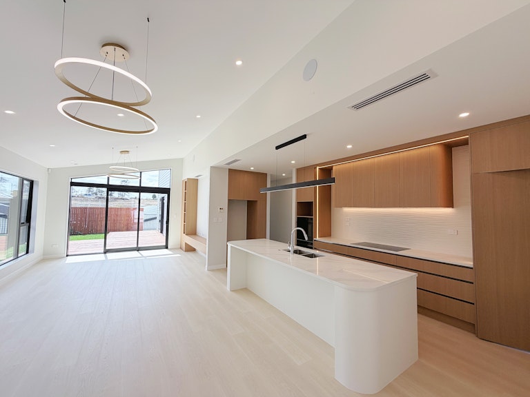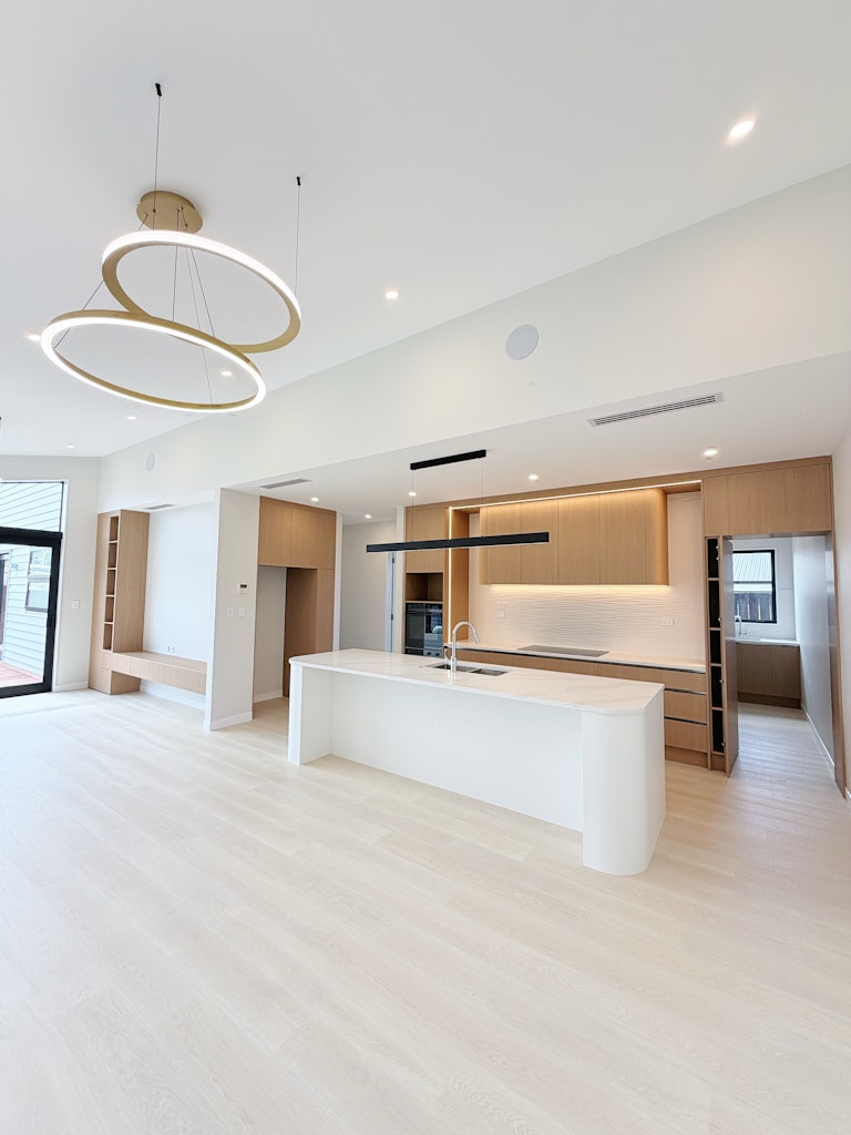 • Open-plan kitchen, dining & living with raked ceilings