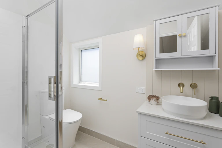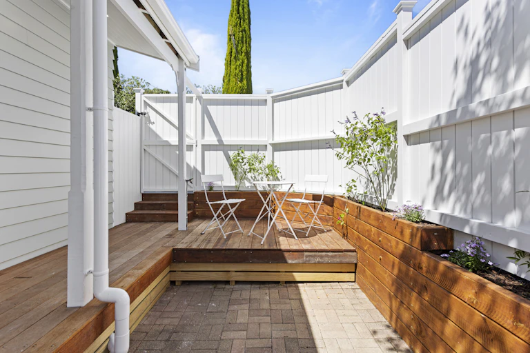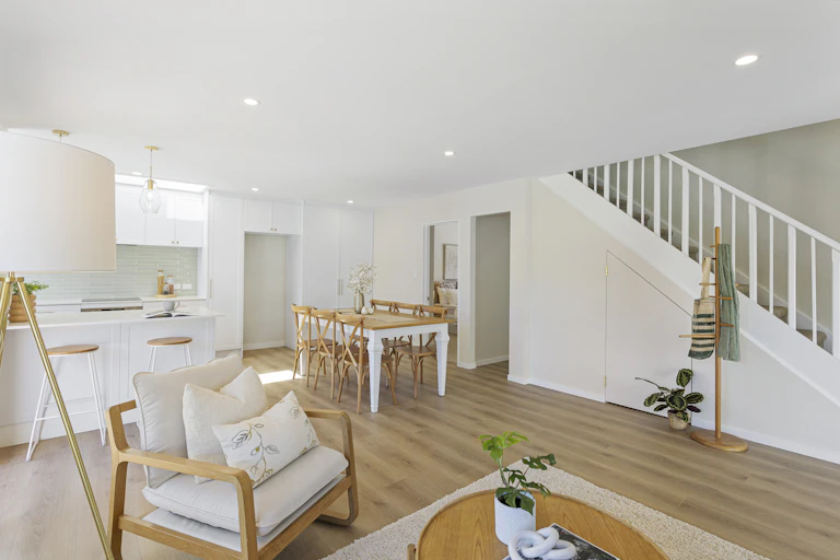The light-filled open-plan kitchen, dining and living area is the heart of the home, anchored by a brand-new shaker-style kitchen with engineered stone benchtops. Double glazing, improved insulation and durable SPC flooring ensure year-round comfort.