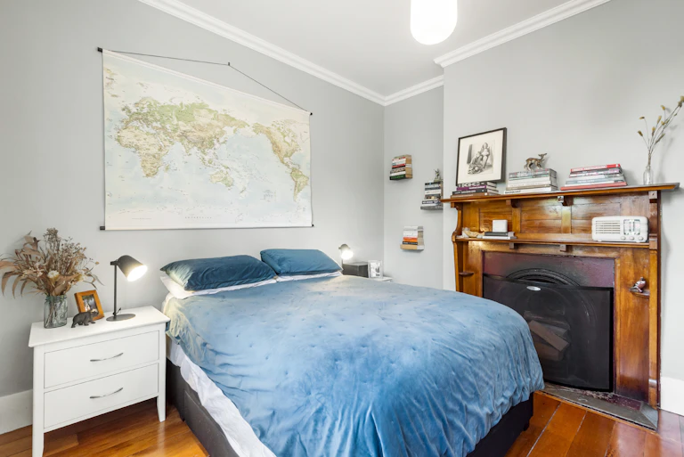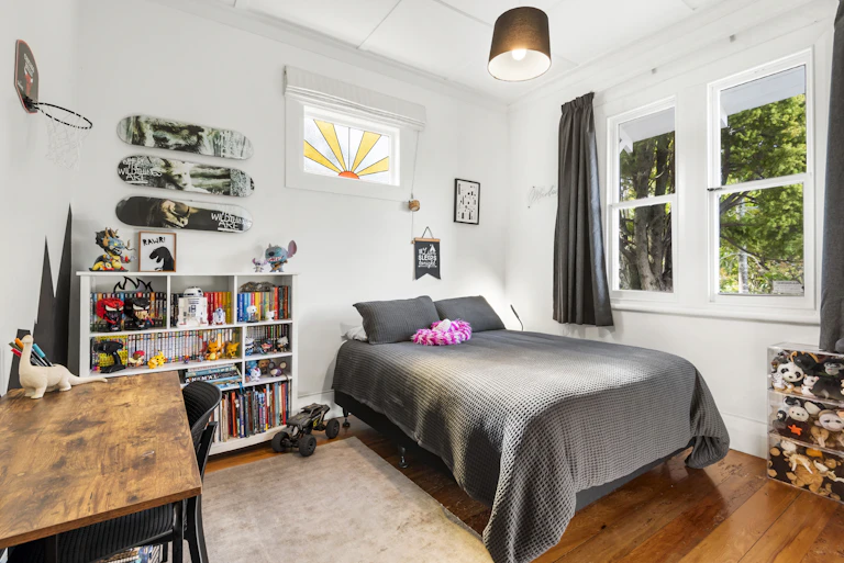 The original front lounge, once centred around a fireplace, now serves as a serene master bedroom. Two additional generous bedrooms with high ceilings provide beautiful spaces for growing children.
