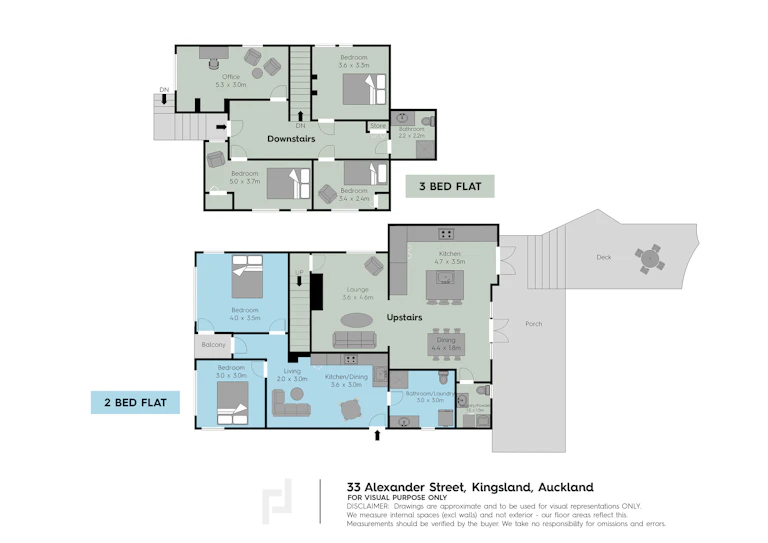 The second flat provides three bedrooms, a bathroom, separate laundry, additional toilet and a versatile rumpus room or office.